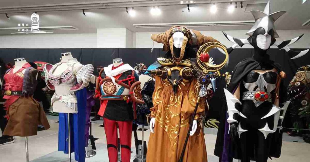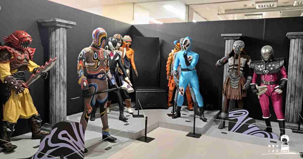 玩具コーナーをはさんで、悪の組織と女性幹部のダークな造形や衣装!これはハロウィーン時期に単独でヴィランフェスとかもさそうですね。大人になってくると悪もあってこそのヒーローという見方も出てきて。ぱきっと明快なヒーローたちに比べ複雑なデザインや生き物、空想の獣、鎧や人造人間的メタリックな雰囲気など質感の多様さも興味深いですね!