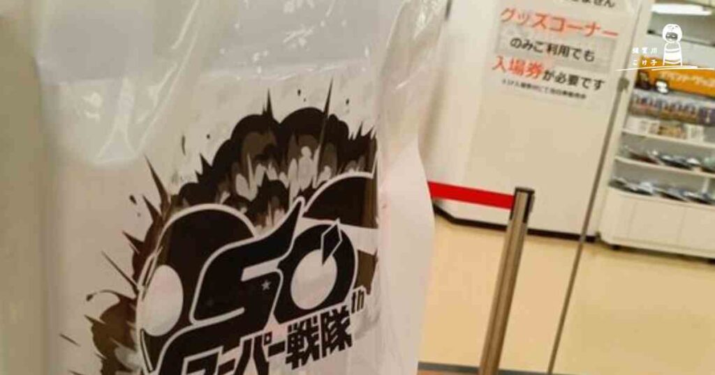 地下フロアにグッズコーナーが展開されています。こちらは入場券を提示しないと入れないので、おかいものだけはNG。本展示のロゴ入りアイテムのほか充実した戦隊グッズで迷う迷う。